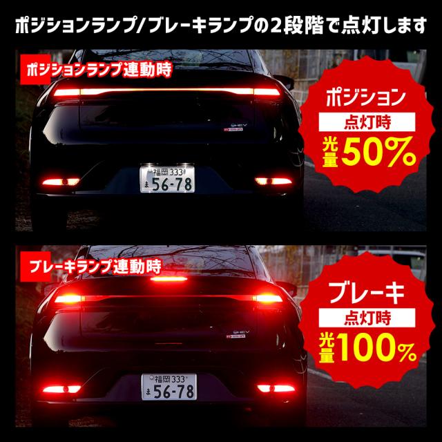 | LED点灯は『ポジションランプ』または『ブレーキランプ』に連動して点灯します。ポジションランプ連動時は50%、ブレーキランプ連動時は100%の光量で点灯します。 |