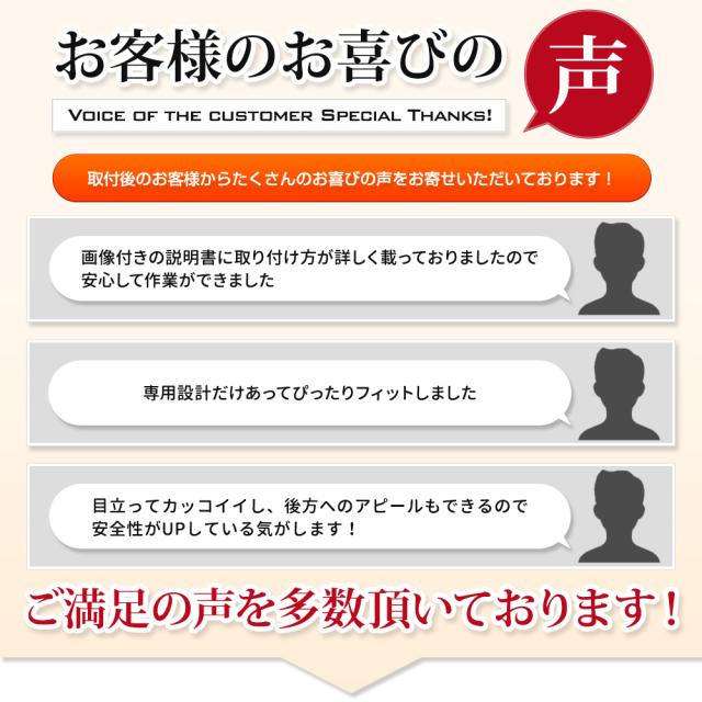 | ■本商品をお取り付けの際は、電動ドリルなどの穴開け工具が必要になります。 ■車検基準を満たした反射機能付きレンズとなっております。車検時は非点灯させていただければ車検対応となりますが、実際に確認する試験官・試験場所によっては車検に適合しないと判断される場合がございます。その際は純正に戻した上で車検を行ってください。 ■本製品をお取り付けおよびご使用の際、車両側に使用前との変化が生じた場合の故障、事故(破損、キズ、変色など)は当社では責任、補償を負いかねます。 |