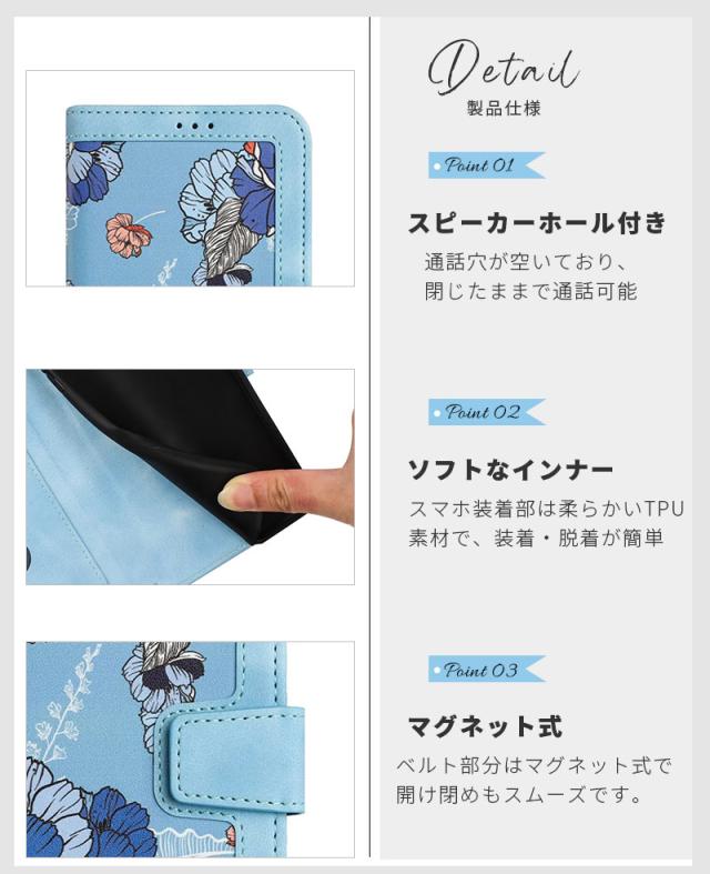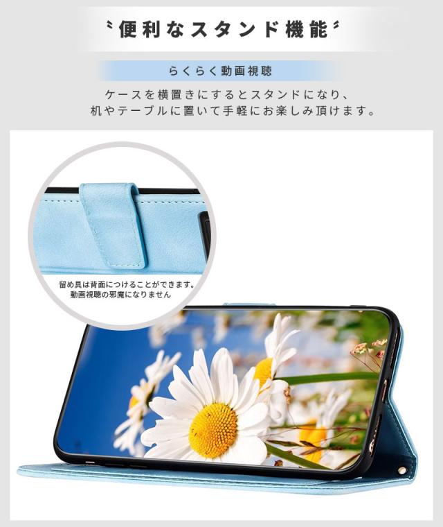 | ・厳選素材を使用 高品質な素材で作られ、心地よい手触りです。耐久性も申し分ありません。 ・カードポケット付 カード収納ポケットを備えており、お出かけの際に役立ちます。 ・ストラップ付き 取り付けが可能な可愛いストラップが付き、持ち運びが便利になります。落下防止にも役立ちます。 ・便利なスタンド機能 横置きスタンド機能が付いて、動画鑑賞や読書を楽しめます。 ・本体もしっかり保護 スマホ本体の取り付け部分は衝撃に強いTPU素材で本体を保護します。 |