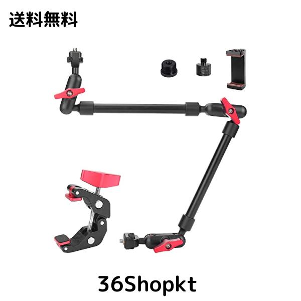??【仕様&注意】?【商品仕様】スーパークランプ:2点1/4ネジ穴+1点の3/8ネジ穴、 マジックアーム:全長-22インチ、取付ネジ:1/4ネジ 全体の耐荷重:約0.25?まで 「パッケージ内容」改良型のスーパークランプ*1 マジックアーム*1 1/4転3/8ネジアダプタ*1 1/4転5/8ネジアダプタ*1 スマホクリップ*1; ?ご注意:※※ご注意:付属のスマホクリップやGopro用マウントは緩々固定できない時に、マジックアームの1/4ネジに丸座金を組み合わせてから締めてください。