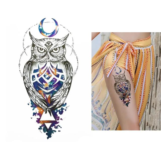 大きいサイズの三目のフクロウをデザインした水で貼るフェイクタトゥーステッカー。