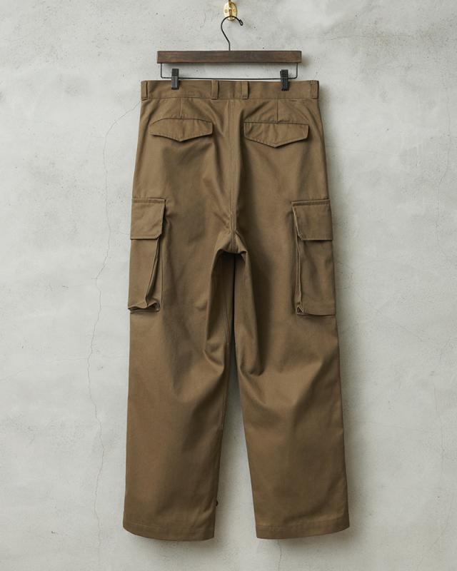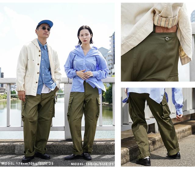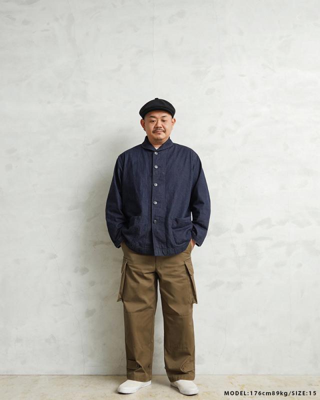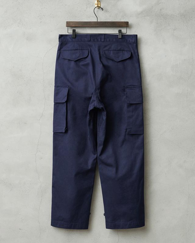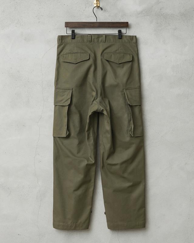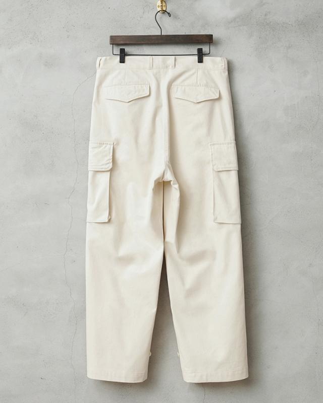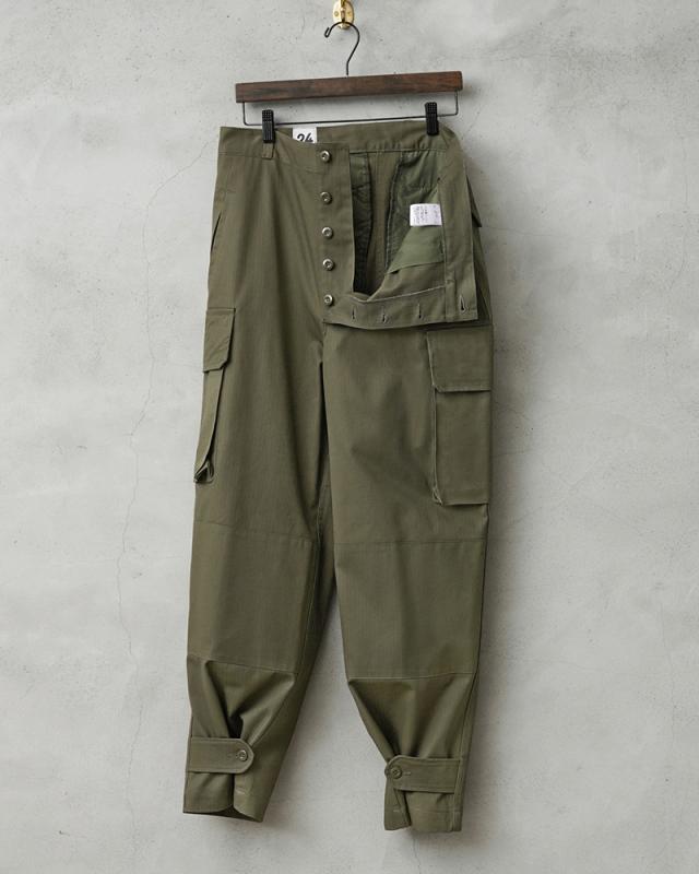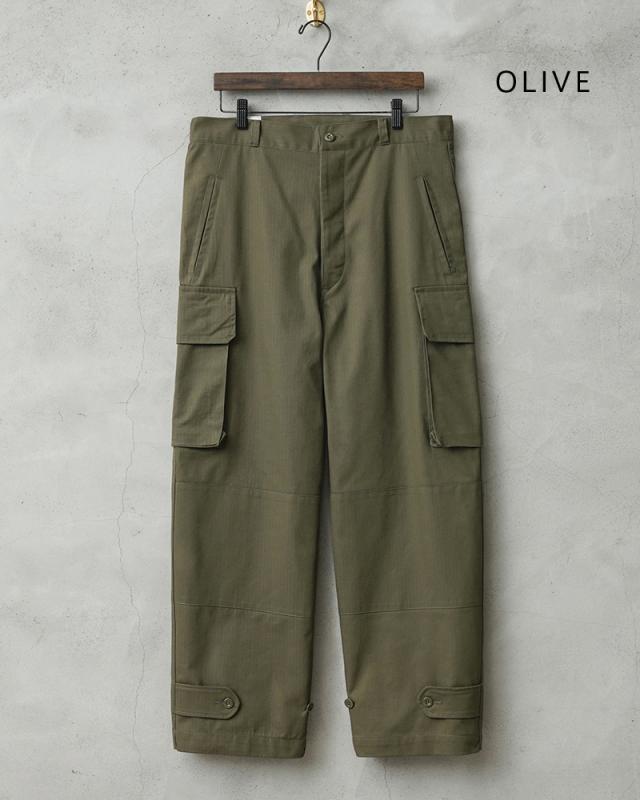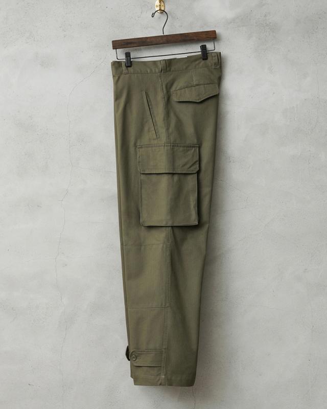 フランス軍の名作中の名作、ヴィンテージアイテムとしても非常に希少価値の高い「M-47カーゴパンツ」。通称後期型と呼ばれるM-47は、生地にHBT(ヘリンボーンツイル)を採用。綾織の向きが交互に変わるヘリンボーン生地は耐久性にも優れ、経年変化した際の風合いも楽しめるワークウェアに適した素材となっています。ヘリンボーンツイルの生地を製作するにあたり、実物の生地を分析、二種類の糸をミックスし織り上げることで、当時のヴィンテージさながらなムラのある織りを再現することに成功。織機の調整など何度もテストし納得の行く風合いの生地が完成しました。前期モデルが1947年〜1950年代ごろに採用されていたのに対し、今回製作した後期型は60年代に採用されていたと言われています。特徴としてはマチがついた大きめなサイドのカーゴポケット。フラップの内側にはさらにボタン留めのフラップが配置された実用性重視のつくりになっています。