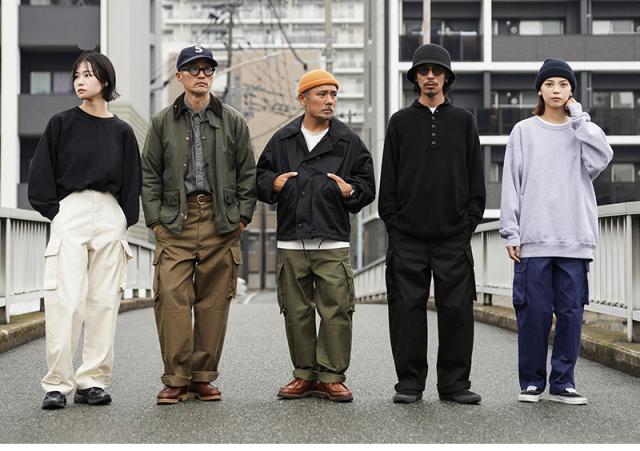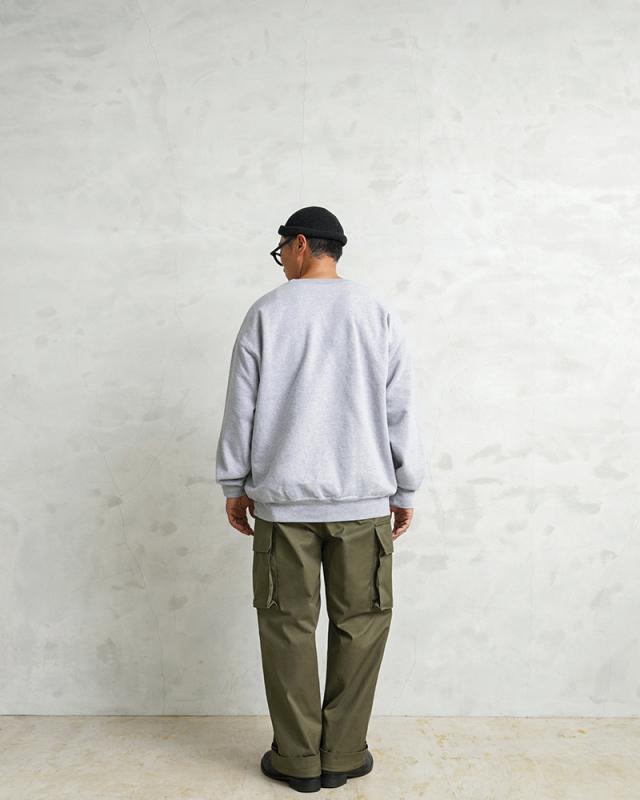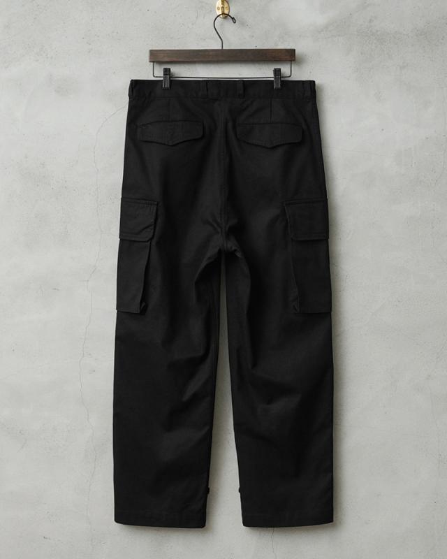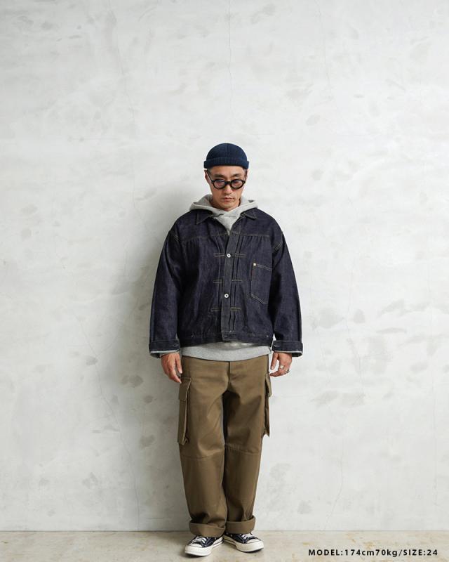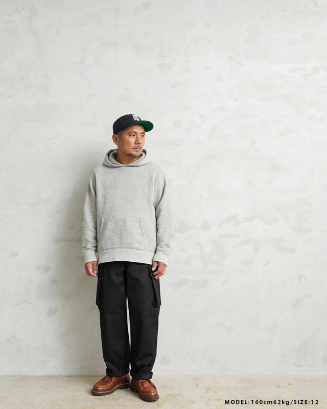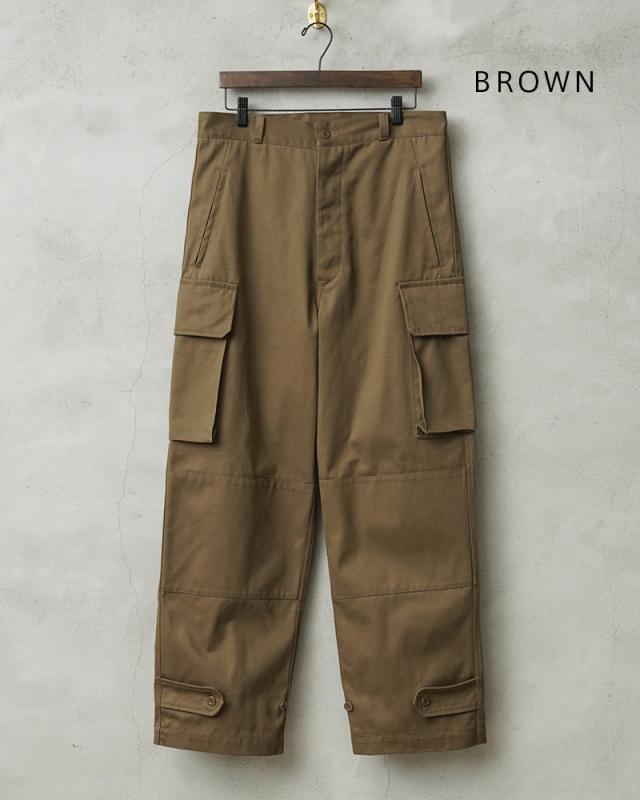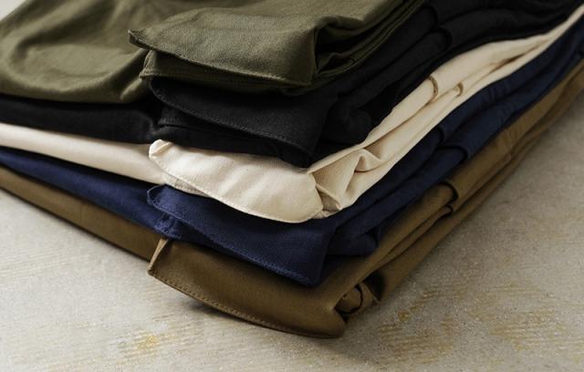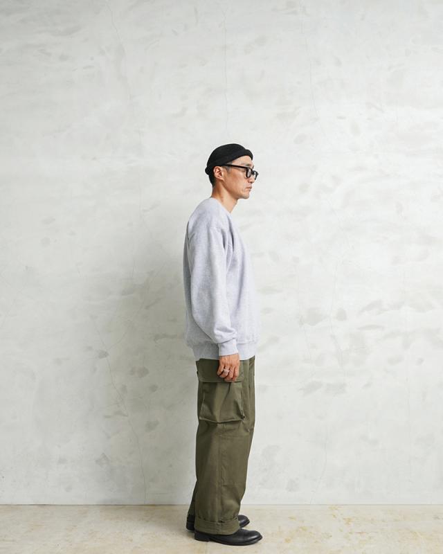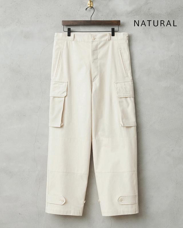 フランス軍の名作中の名作、ヴィンテージアイテムとしても非常に希少価値の高い「M-47カーゴパンツ」。通称後期型と呼ばれるM-47は、生地にHBT(ヘリンボーンツイル)を採用。綾織の向きが交互に変わるヘリンボーン生地は耐久性にも優れ、経年変化した際の風合いも楽しめるワークウェアに適した素材となっています。ヘリンボーンツイルの生地を製作するにあたり、実物の生地を分析、二種類の糸をミックスし織り上げることで、当時のヴィンテージさながらなムラのある織りを再現することに成功。織機の調整など何度もテストし納得の行く風合いの生地が完成しました。前期モデルが1947年〜1950年代ごろに採用されていたのに対し、今回製作した後期型は60年代に採用されていたと言われています。特徴としてはマチがついた大きめなサイドのカーゴポケット。フラップの内側にはさらにボタン留めのフラップが配置された実用性重視のつくりになっています。