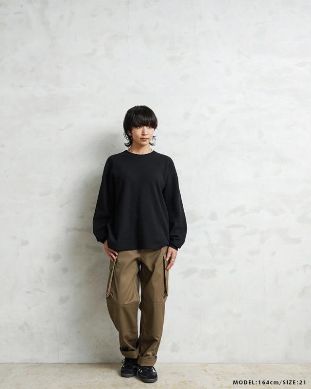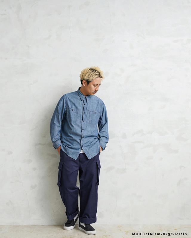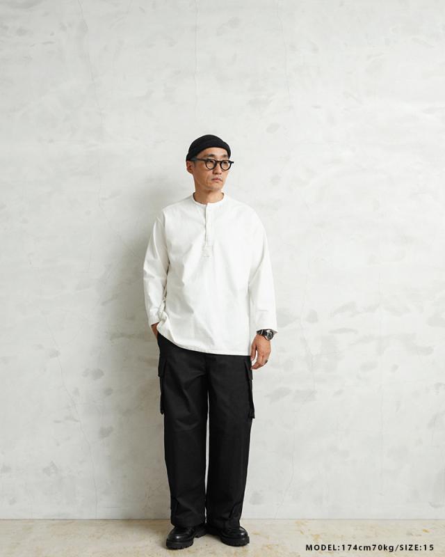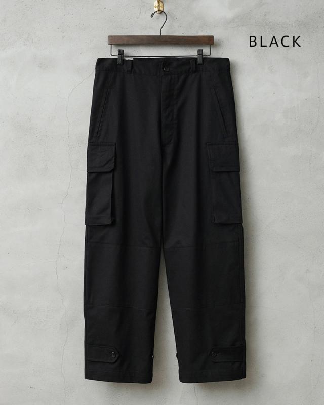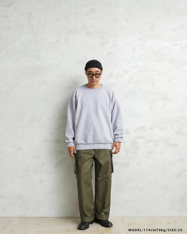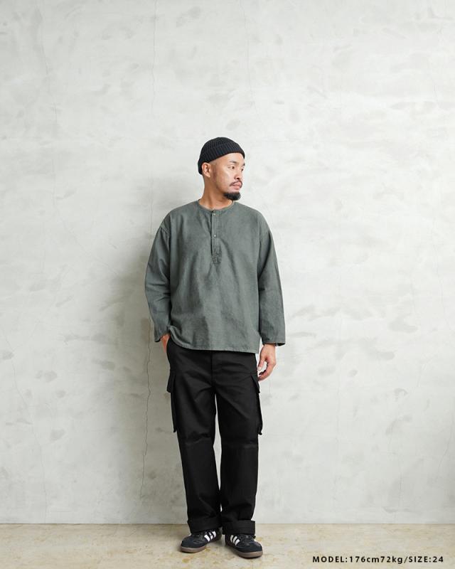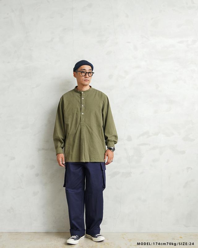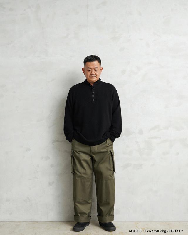 フランス軍の名作中の名作、ヴィンテージアイテムとしても非常に希少価値の高い「M-47カーゴパンツ」。通称後期型と呼ばれるM-47は、生地にHBT(ヘリンボーンツイル)を採用。綾織の向きが交互に変わるヘリンボーン生地は耐久性にも優れ、経年変化した際の風合いも楽しめるワークウェアに適した素材となっています。ヘリンボーンツイルの生地を製作するにあたり、実物の生地を分析、二種類の糸をミックスし織り上げることで、当時のヴィンテージさながらなムラのある織りを再現することに成功。織機の調整など何度もテストし納得の行く風合いの生地が完成しました。前期モデルが1947年〜1950年代ごろに採用されていたのに対し、今回製作した後期型は60年代に採用されていたと言われています。特徴としてはマチがついた大きめなサイドのカーゴポケット。フラップの内側にはさらにボタン留めのフラップが配置された実用性重視のつくりになっています。