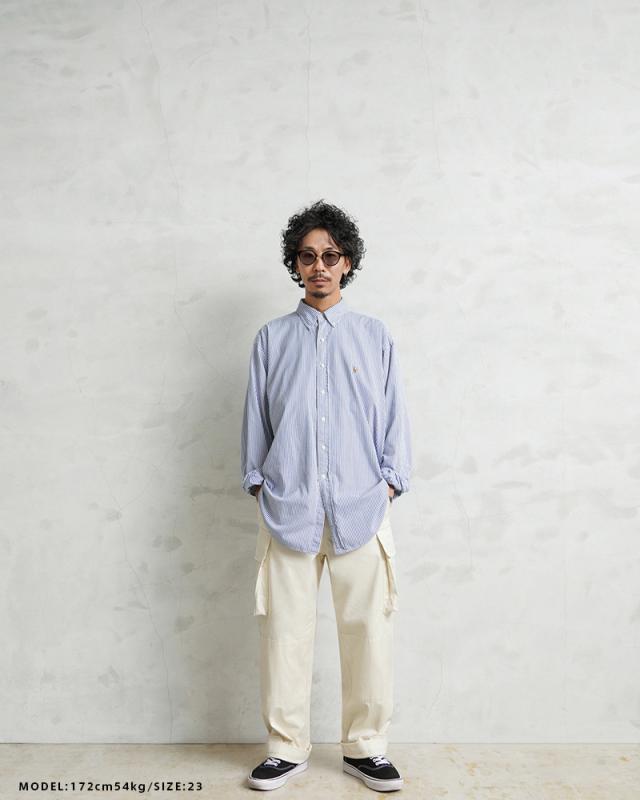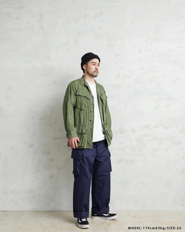 | 商品説明 | フランス軍 M-47 カーゴパンツ 後期型 HBT WAIPER.incのご紹介です。 品名:FRENCH ARMY M-47 CARGO PANTS 品番:WP1026 フランス軍の名作中の名作、ヴィンテージアイテムとしても非常に希少価値の高い「M-47カーゴパンツ」。 通称後期型と呼ばれるM-47は、生地にHBT(ヘリンボーンツイル)を採用。綾織の向きが交互に変わるヘリンボーン生地は耐久性にも優れ、経年変化した際の風合いも楽しめるワークウェアに適した素材となっています。 ヘリンボーンツイルの生地を製作するにあたり、実物の生地を分析、二種類の糸をミックスし織り上げることで、当時のヴィンテージさながらなムラのある織りを再現することに成功。織機の調整など何度もテストし納得の行く風合いの生地が完成しました。 前期モデルが1947年〜1950年代ごろに採用されていたのに対し、今回製作した後期型は60年代に採用されていたと言われています。 特徴としてはマチがついた大きめなサイドのカーゴポケット。フラップの内側にはさらにボタン留めのフラップが配置された実用性重視のつくりになっています。ダメージを受けやすい両ヒザ部分は生地を二重に張り合わせダブルニー仕様。フロントは深い股上のボタンフライが特徴です。裾のストラップを調節してシルエットの変化もお楽しみいただけます。また、裾にかけて前期型よりもごくわずかにシェイプされており、よりキレイなシルエットとなっています。 クオリティとプライスを高い次元で両立した、WAIPERが自信を持ってお薦めするイチオシの一本です。 | ||||||||||||||||||||||||||||||||||||||||||||||||||||||||||||||||||||||||||||||||||||||||||
