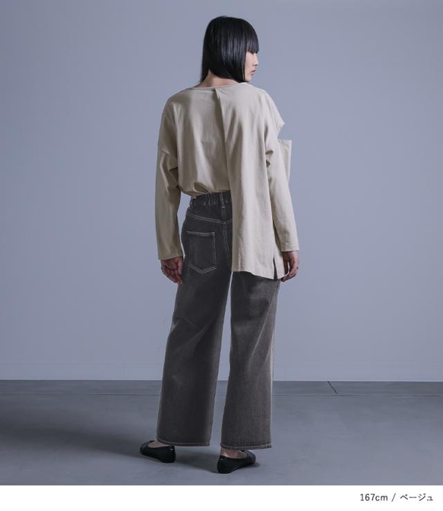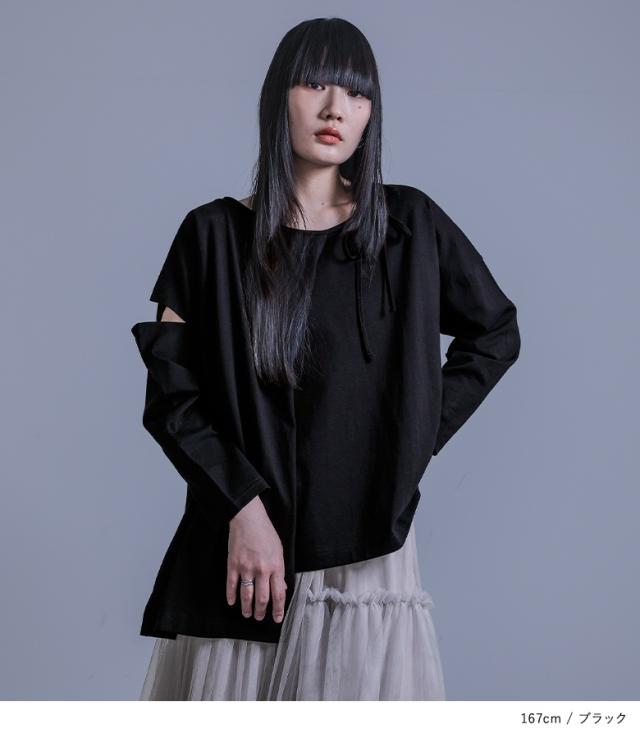 『アシメカッティングロンT』※メール便可※【10】[ ロンT トップス カットソー レディース 長袖 アシメ アシンメトリー スリット コットン100% 綿100% 肩開き 抜け感]