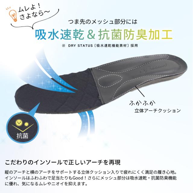 | 幅設計:2E(標準幅) 防水設計(防水シート仕様)※完全防水ではありません。 屈曲性:オリジナル設計ソール、屈曲ミッドソール、立体インソール3層の組み合わせで歩行に適した柔軟な屈曲性があります。 防滑ソール:接地面に配置した凹凸加工で、着地時の横滑りを低減します。 静音リフト:歩行時のコツコツ音を軽減する静音リフトを使用しています。 ECOBLUE:ライニングや、中敷きのメッシュ部分にペットボトルのリサイクルポリエステル繊維"ECOBLUE"を原材料とした素材が使用されています。 DRY STATUS:中敷きメッシュ部分に吸水速乾、抗菌防臭加工を施しています。 |
