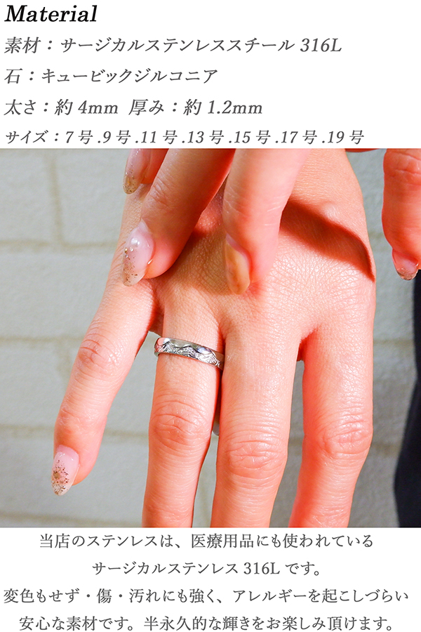 当店のステンレスは、医療用品にも使われているサージカルステンレス316Lです。変色もせず・傷・汚れにも強く、アレルギーを起こしづらい安心な素材です。 半永久的な輝きを演出します!