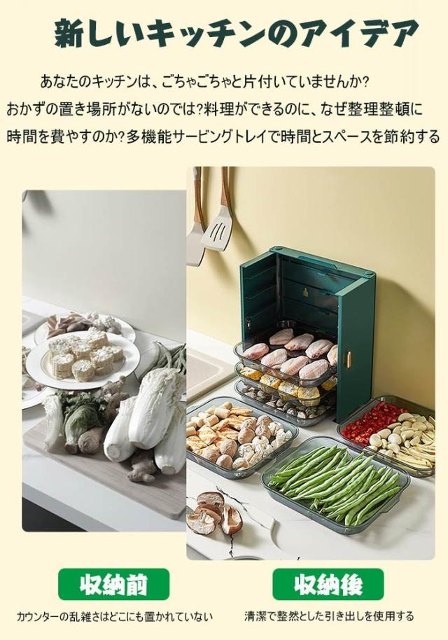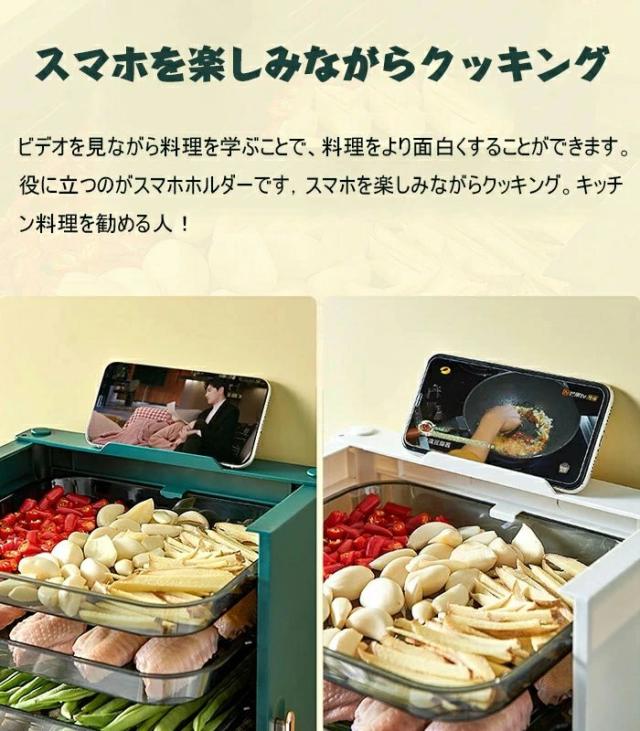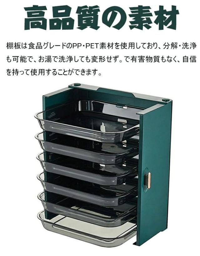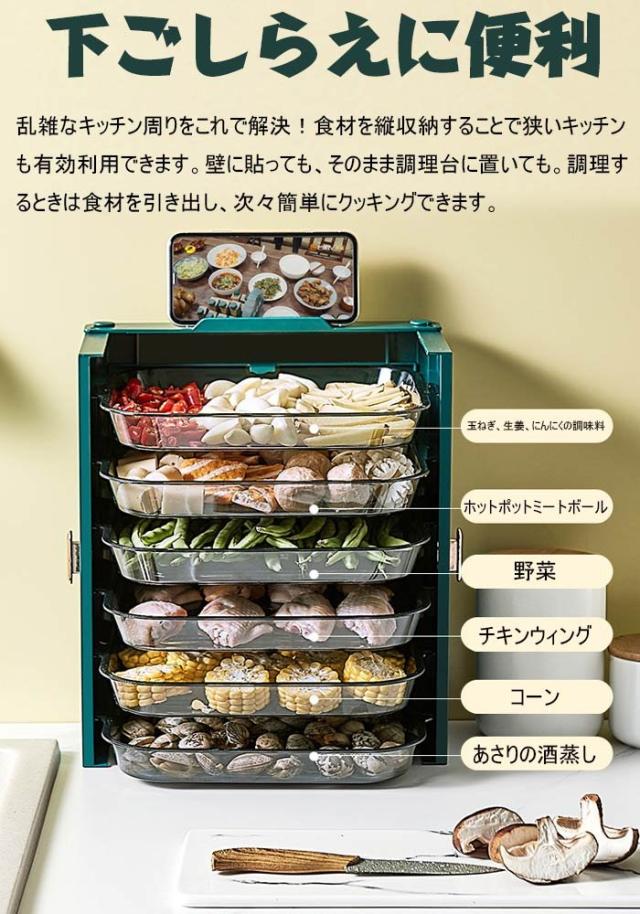 引き出しデザイン:プレートは半透明デザインを採用しているため、調理時に必要な食材が一目で わかります。1層1コンパートメント。分類されたストレージ。最大6種類の食材を分類しておくこと ができるので、食材が混ざる心配がありません。調味料ラック、フルーツラック、スナックラック など、キッチンを明るくする多機能キッチン収納ラックとしても機能します。