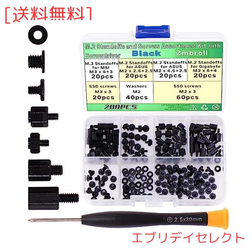 パッケージ内容: 便利なボックスに入ったblackのコンピューターネジ200個。 【内容】 M.2 スタンドオフ MSI M3 x 6+3用 --- 20個。 ASUS M2 x 2.5+2.5用M.2スタンドオフ---20個。 ASUS M2 x 4.5+2.5用M.2スタンドオフ---20個。 M.2 スタンドオフ ギガバイト M2 x 6+4 --- 20個。 M3x3 SSDネジ--- 20個。 M2 x 3 SSDネジ---60個。 M2ワッシャー --- 40個。 磁気ドライバー --- 1個。