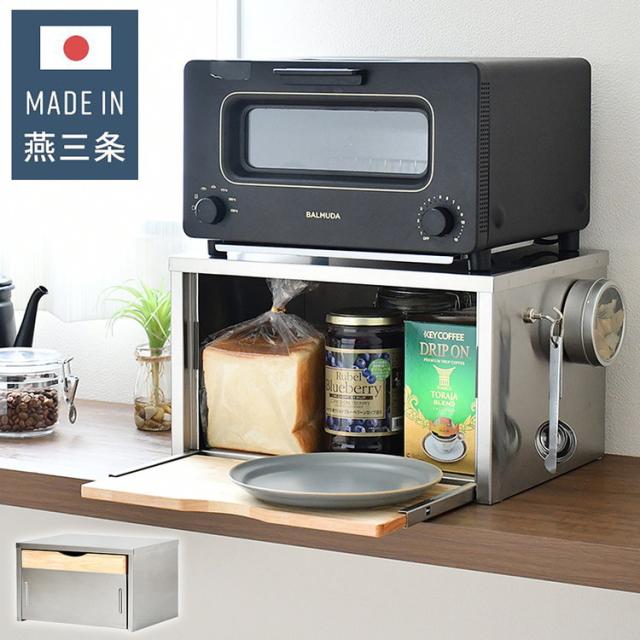 日本製 燕三条 ウッドとステンレスのブレッドケース 外せる木製トレー付き 頑丈 奥行28 トースターラック ブレッドケース 前開き 扉 キッチン収納 ブレッドボックス 食パン ジャム コーヒー 収納(代引不可)【送料無料】