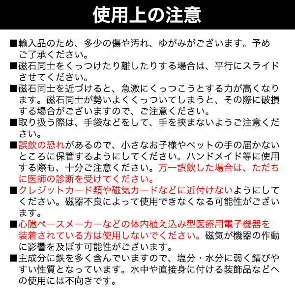 ■磁石同士を近づけると、急激にくっつこうとする力が高くなります。磁石同士が勢いよくくっついてしまうと、その際に破損する場合がございますので、ご注意ください。