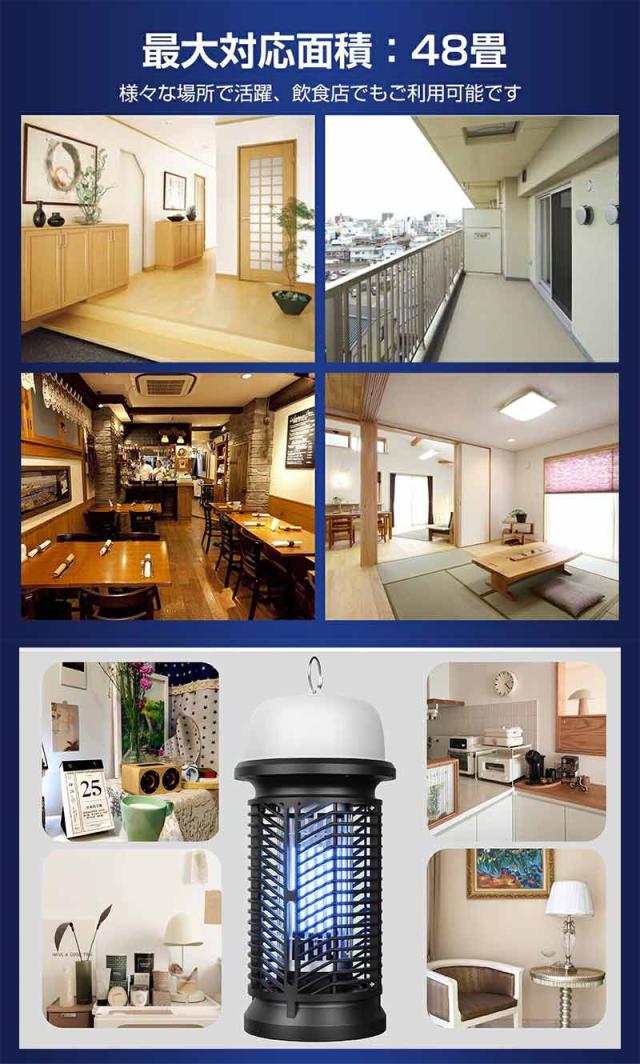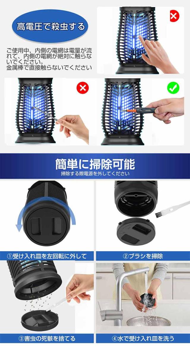 IPX4生活防水構造で、雨が降っている屋外でも使えます。使い方は吊り下げ式&据え置き式2WAY仕様で、庭やリビングやダイニングや玄関や飲食店やビニールハウスや畑など場所を選ばずに蚊、蛾、ハエ等羽虫を駆除します。