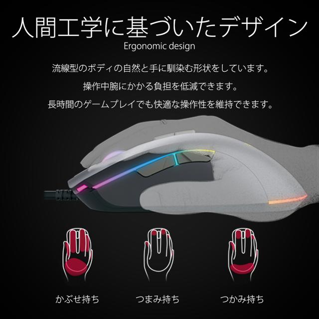 ●重量110gと非常に軽量でかぶせ持ち、つかみ持ち、つまみ持ちと様々な持ち方に対応しておりユーザーを選びません。より安定した高速クリックを可能としています。人間工学デザインに基づいたフォルムで持ちやすく疲れにくい設計になっています。