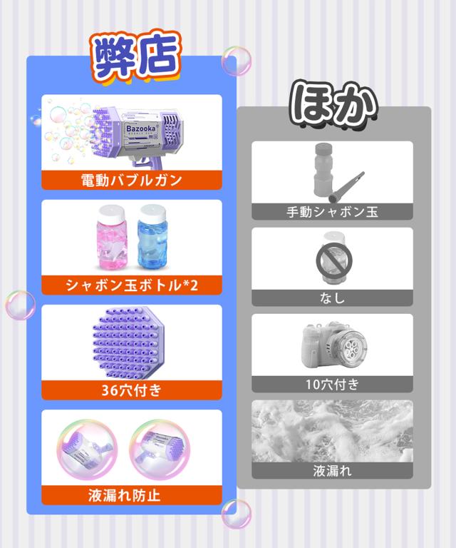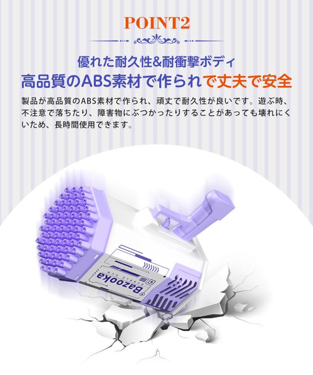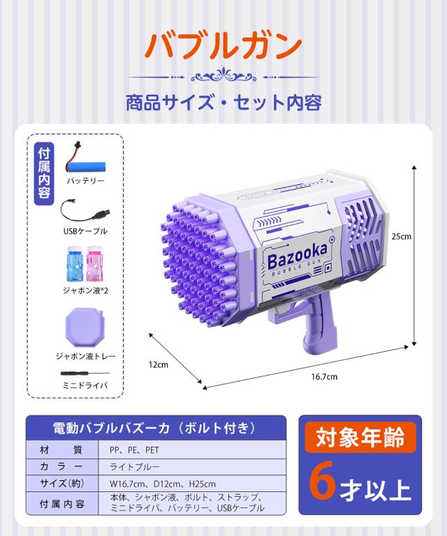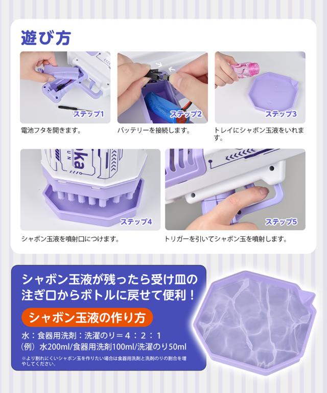 バブルガンが子供のために安全な非毒性のPETプラスチックで作られています。可愛い配色、無味無毒で安心です。6歳以上のお子様のご利用をお勧めします。6歳以下のお子様は、大人のご案内のもとご利用下さい。