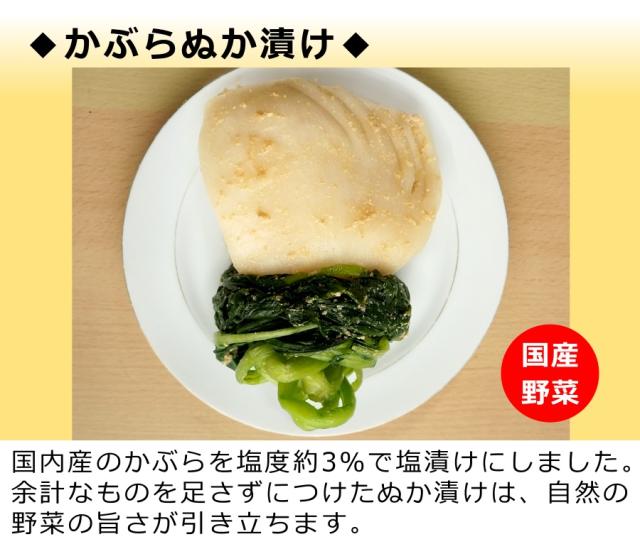 | ■商品内容: | 白菜ぬか漬け 200g / 大根ぬか漬け 1個 / 大長なすぬか漬け 1本 / かぶらぬか漬け 1束 (夏季はうり半割漬けに変更の場合あり)/ 胡瓜ぬか漬け 1本 / 人参ぬか漬け 半切 |