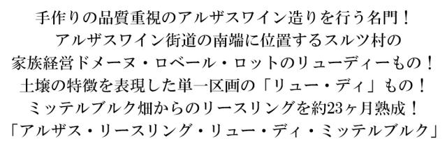 アルザス リースリング リュー ディ ミッテルブルク 2019ドメーヌロベールロット元詰(4代目当主ヴィクトール ロット家)AOCアルザスリースリング