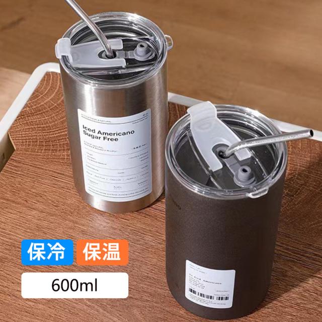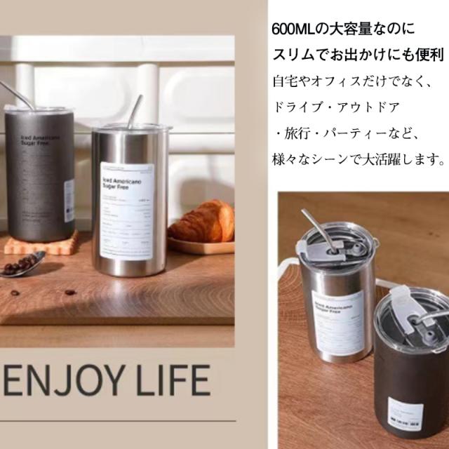 タンブラー 水筒 蓋付き タンブラー 600ml ストロー付き 二重構造保温 保冷 真空断熱 コーヒーカップ 持ち運び