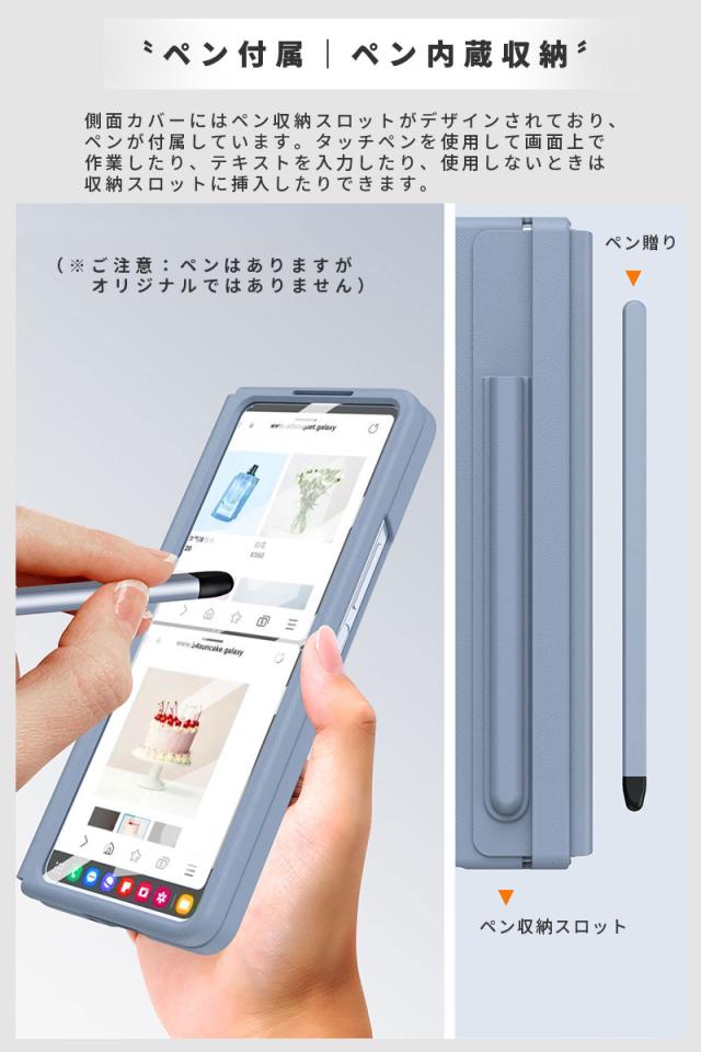 | ・ペン贈り|ペン内蔵収納 側面カバーにはペン収納スロットがデザインされており、ペンが付属しています。タッチペンを使用して画面上で作業したり、テキストを入力したり、使用しないときは収納スロットに挿入したりできます。 (※ご注意:ペンはありますがオリジナルではありません) ・伸縮ヒンジ保護 伸縮ヒンジ保護カバー付きで、ヒンジが傷つくのを防ぎます。 ・折りたたみ式 180°に折りたたむことができるスマホケースです。 ・高感度のサブ画面保護 サブスクリーンには高透明度と高感度の一体型強化ガラスフィルムを搭載し、 画面本来の高感度タッチ同時に擦り傷防止ができます。 |