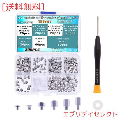 パッケージ内容: 便利なボックスに入ったシルバーのコンピューターネジ200個。 【内容】 M.2 スタンドオフ MSI M3 x 6+3用 --- 20個。 ASUS M2 x 2.5+2.5用M.2スタンドオフ---20個。 ASUS M2 x 4.5+2.5用M.2スタンドオフ---20個。 M.2 スタンドオフ ギガバイト M2 x 6+4 --- 20個。 M3x3 SSDネジ--- 20個。 M2 x 3 SSDネジ---60個。 M2ワッシャー --- 40個。 磁気ドライバー --- 1個。
