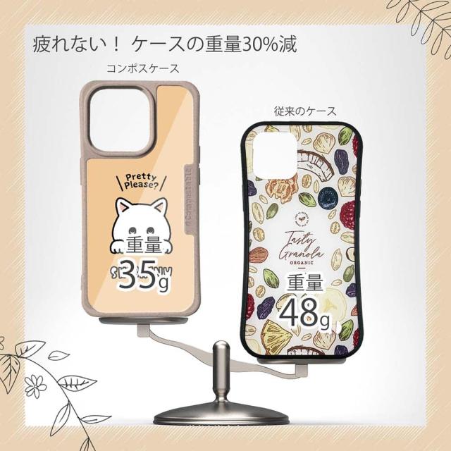 | 注意事項 | コンポスケースは、フレーム部分に「生分解性プラスチック」という環境に優しい素材を使用しております。そのため擦ったり、ぶつけたりする衝撃を与えると脆い部分もあります。耐衝撃ケースではないことをご了承ください。 Qi充電やMagSafe充電にも対応していますが、装着していない時に比べると充電速度は落ちます。 |