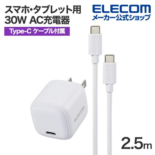 エレコム スマホ・タブレット用 30W AC充電器 C-C ケーブル付属 USB PD 充電器 USB-C 1ポート 2.5m ホワイト