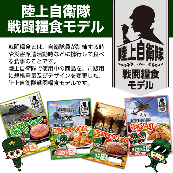 “陸上自衛隊”で使用中の商品を、市販用に規格重量及びデザインを変更した、“陸上自衛隊”戦闘糧食モデルです。