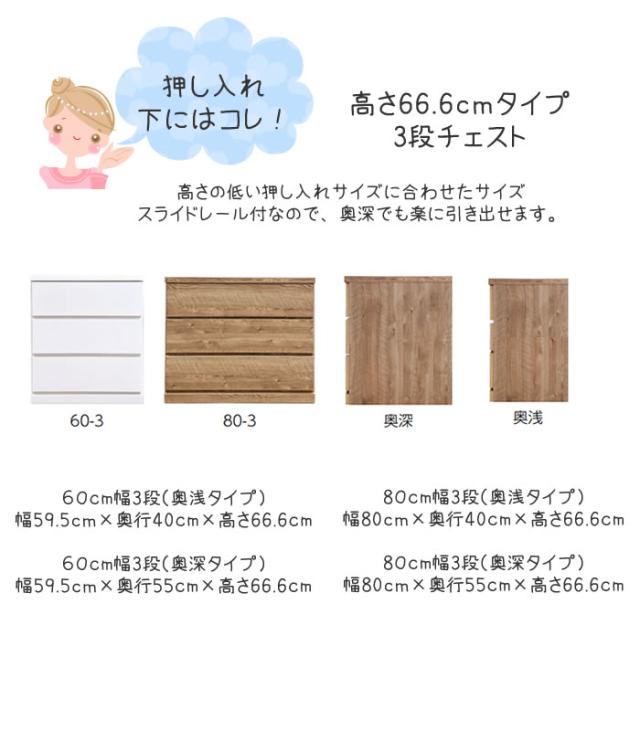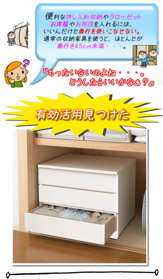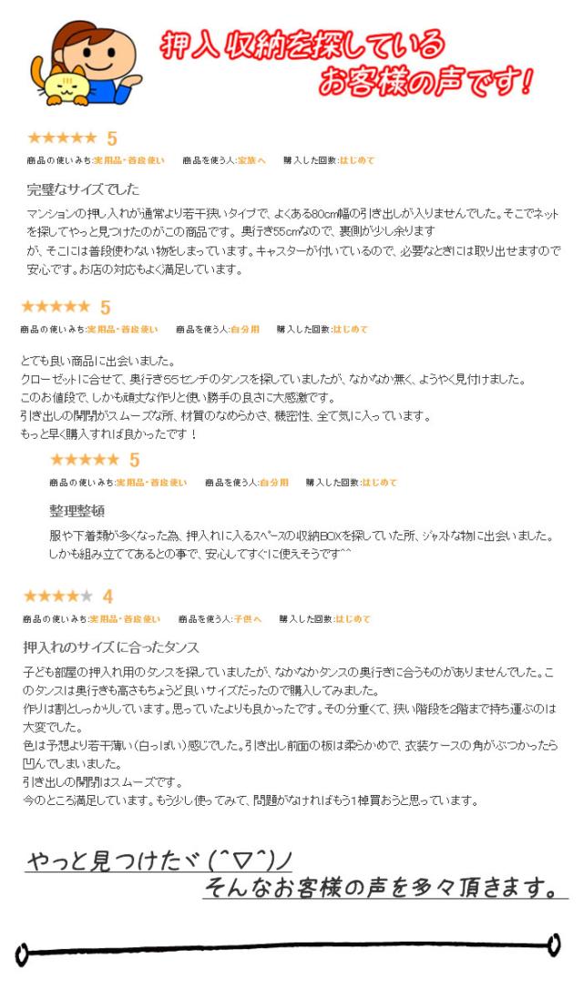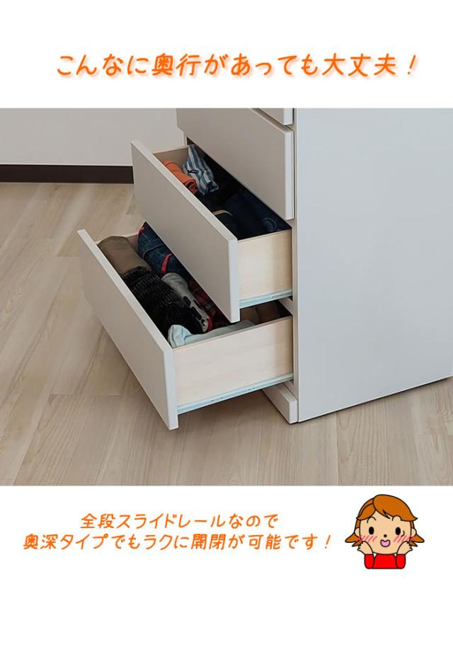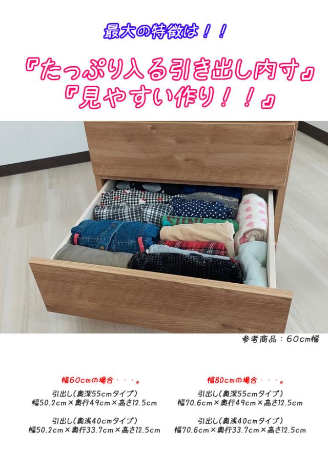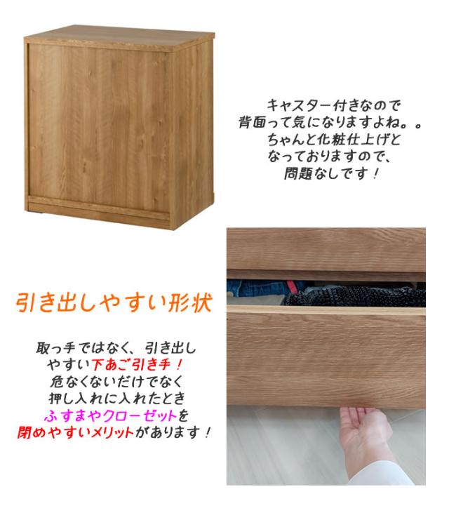 押し入れやクローゼットにピッタリのチェストです。 奥行き 55cmで押し入れやクローゼットを有効活用できます。 クローゼットには奥浅タイプも便利です。 キャスターが付いているので、通常は、押し入れやクローゼットに入れたままでも 衣替えや動かして使いたいときなどに、とても便利です。 幅サイズは、60cm・80cmのタイプ 奥行は、奥浅タイプ(奥行40cm)・奥深タイプ(奥行55cm) 色は、ナチュラルとホワイト 【POINT】 ■奥行55cmでたっぷり収納! 奥行55cmのたっぷり収納サイズ。通常の奥行サイズのチェストよりも 1.5倍以上の収納が可能です。 ■全段スライドレール付き引き出し 引き出しの奥行も深いので、お洋服が確認しやすい仕様。 引き出しの中身が全部見ることが出来て、収納も見るのも簡単です。 ■キャスター付きチェストで移動・掃除がラクラク! キャスターが付いているので、移動や掃除がとてもラクに出来ます。 女性の方や子供でも簡単に動かすことが出来ます。 ■強度UP&衣類に優しい地板仕様 引き出し間は奥まで地板を入れました。これにより本体の強度が大きくUPします。 さらに、引き出し開閉時に、開けた引き出しの底面裏側が 下の引き出し内の洋服に擦れることが防げます。 地板仕様は衣類にとっても優しいのです。 押入収納・クローゼットチェスト・押し入れ収納 としてとても便利です。 |