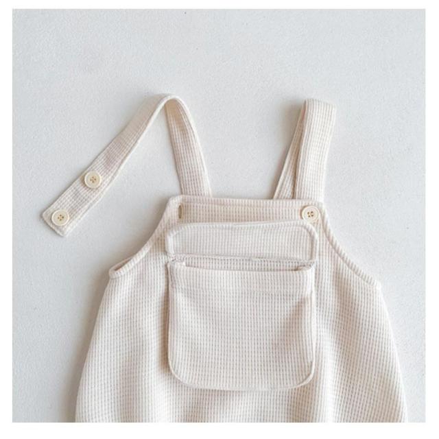 | 心地よい柔らかいワッフル素材がおしゃれなキッズサロペット。 着回し力抜群の無地サロペット、合わせるトップス次第で季節問わず使用できます。 赤ちゃんのお肌に優しく、通気性や汗の吸収性も良いです。 カジュアルで大きなポケットが可愛いデザインで男女問わず着用していただけます。 股部分はスナップボタンなのでオムツ替えも楽々。 | |