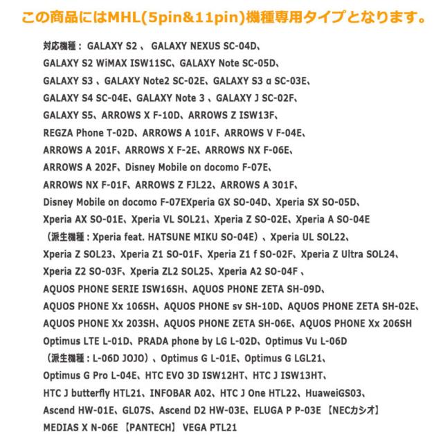 本製品はMHL対応のスマートフォン専用のものです。非対応の機種では画面が出力されませんので、ご購入の前に、
