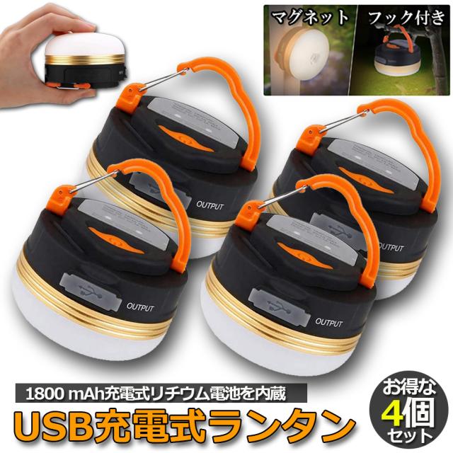 【お得な【4個セット】になります。】【電球色のLEDランタン】:太陽や炎のように陽気で暖かなオレンジ色の電球を採用、お部屋での普段使いから、アウトドアシーンや緊急時まで、様々な場面で活躍する優れもの。USB給電ライプで、USBケープルを接続して充電可能。1800mahのリチウム電池が内蔵されており、長時間点灯可能となります。*電源指示灯のランプが緑色点滅→充電中、緑色点灯→充電完了、赤色点灯→点灯中。