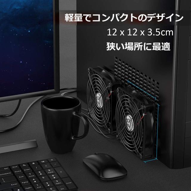 外付けHDD、ルーター、AV機器、スマフォ、PS4ゲーム機などの電子機器を冷やすために設計された冷却扇風機であり、回路基板に熱がこもって発生する熱暴走を未然に防止します。卓上扇風機として、車中泊、空気の循環などのシーンにもご利用いただけます。