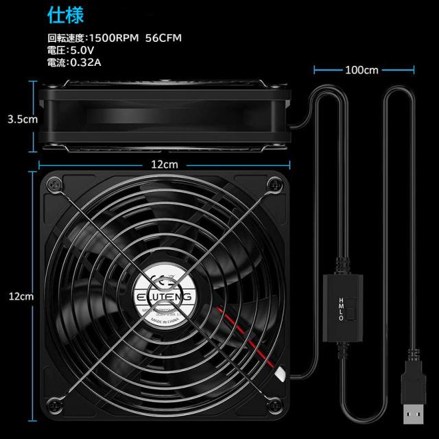 扇風機の風量は3段階(HIGH(ハイ)風回転数:1500RPM Middle(ミドル)風回転数:1200RPM Low(ロー)風回転数:900RPM)で調節可能、冷却対象機器や使用環境に合わせて、風量の強弱が調節できます。USB給電方式を採用して、パソコン、ACアダプター、モバイルバッテリーなどの電力で作動します。