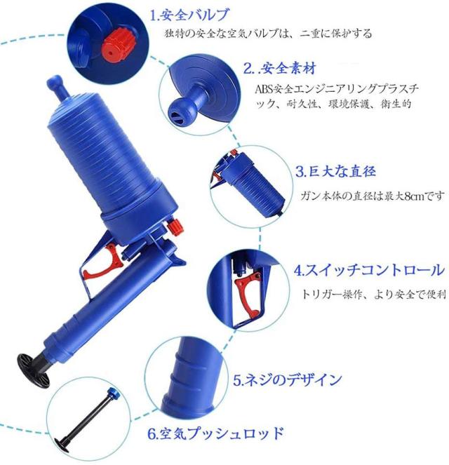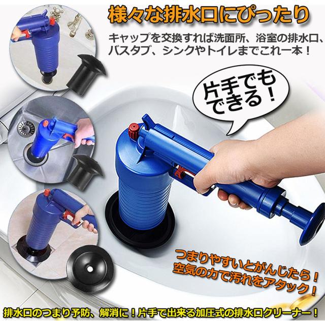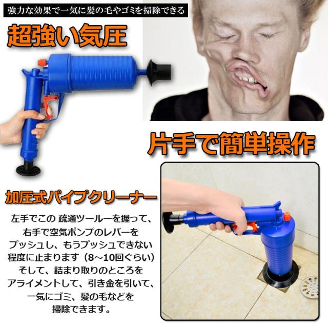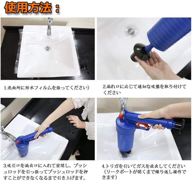 【加圧式パイプクリーナー】排水口のつまり予防、解消に!片手で出来る加圧式の排水口クリーナー! 洗面所、浴室の排水口、バスタブ、シンクやトイレまでこれ一本!様々な排水口にぴったりはまります。空気を溜めて、トリガーを引くだけ!排水管につまった汚れ,においの元を軽減します!【操作簡単】左手でこの 疏通ツールーを握って、右手で空気ポンプのレバーをプッシュし、もうプッシュできない程度に止まります(8〜10回ぐらい)。そして、詰まり取りのところをアライメントして、引き金を引いて、一気にゴミ、髪の毛などを掃除できます。