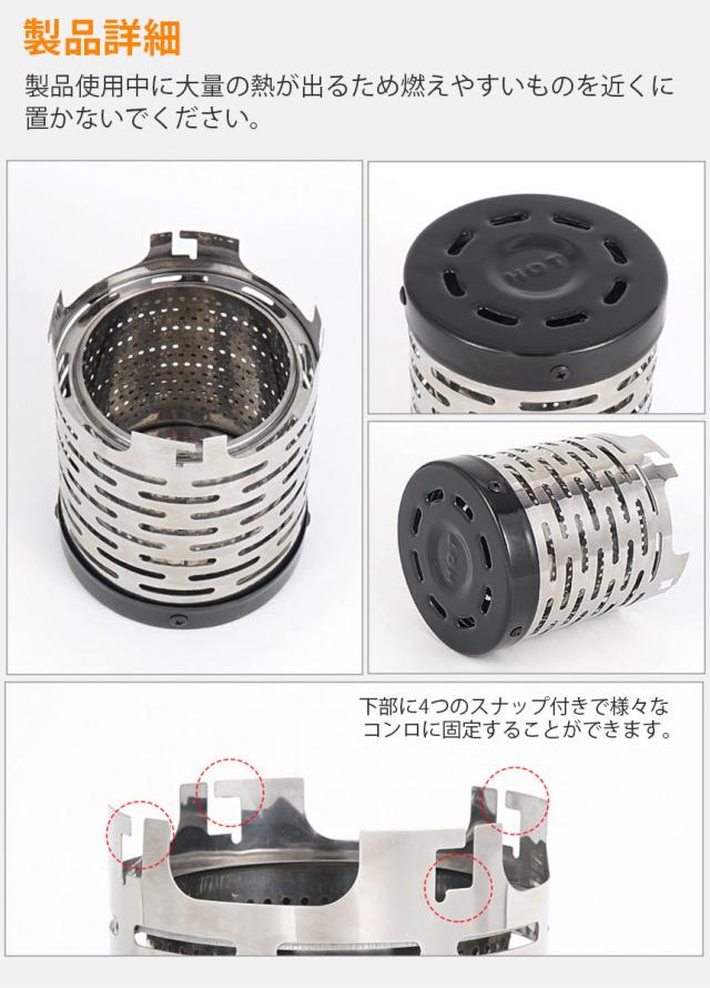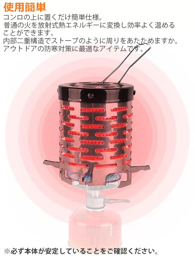 【二重熱放射構造】内部は二重構造で熱伝達を加速することができます。ストーブのように周りを暖かくします。 キャンプ・登山・釣り・ツーリングなど、アウトドアの防寒対策に最適なアイテムです。遠赤外線ヒーターとして使えるアタッチメント。