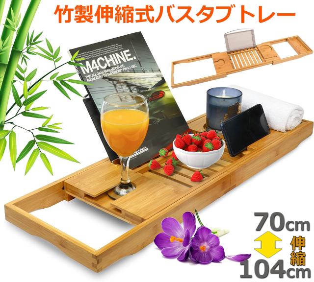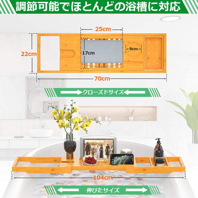 【仕様】サイズ:長さ70から104伸縮可能、幅26、重量:約1.5kg。スマホ、iPad、書類、ワイングラス、化粧品などが置くことが可能。【耐久性】環境に良い竹製で、環境に優しい。無臭また無味で、より安心してご利用いただきます。