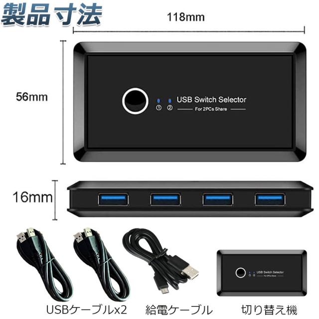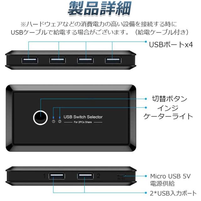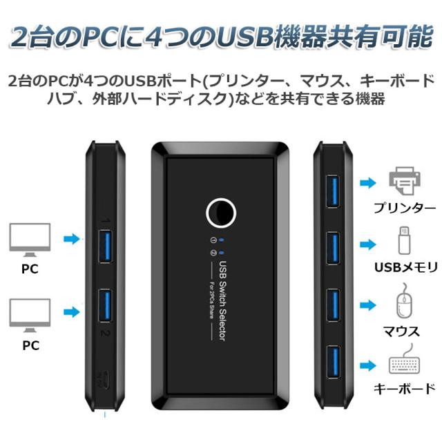 USB 切り替え機 切替器 pc2台用 usb 切替器 USB 4ポート 高速転送 セレクター スイッチ 手動切替器 プリンタ マウス キーボード ハブ ハードディスク など 切替 ケーブル付き