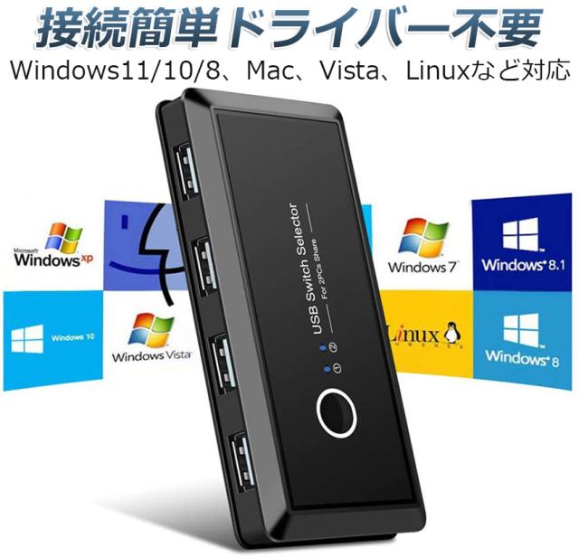 【USB 切替器 PC2台用】1組のプリンタ、マウス、キーボード、外付けハードディスク、ハブなどのUSB機器を2台のパソコンで共有できる切替器です。ノートパソコンでもデスクトップパソコンでも対応しており、2台のPCを1台にまとめて便利です。【USB4ポート】USB4ポート付き、USB2.0準拠のバスパワー動作で480Mbpsの高速データ送信に対応しています。従来のUSB1.1機器の接続も可能です。インターフェース(パソコン側):USB×2;インターフェース(周辺機器側):USB ×4。
