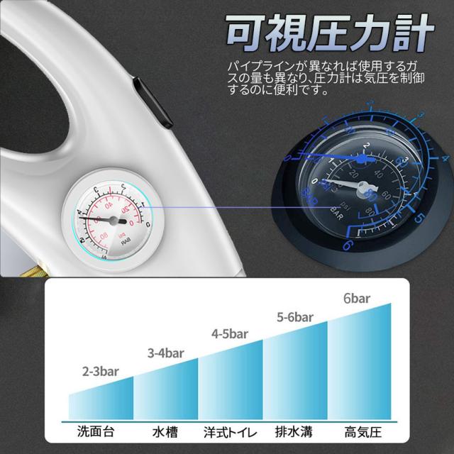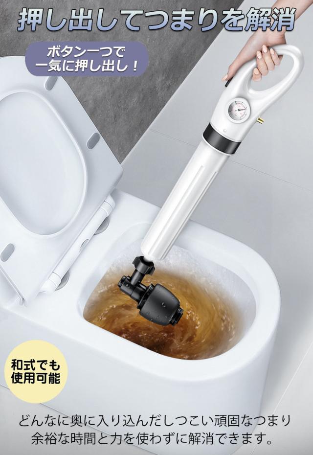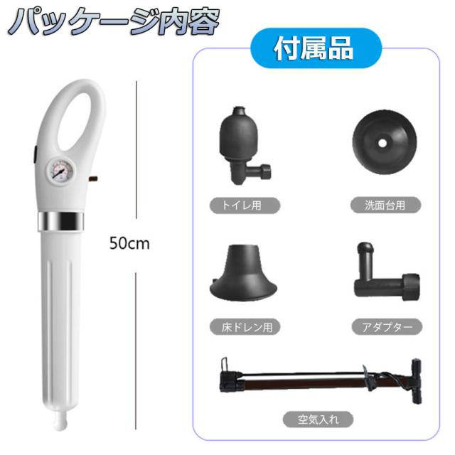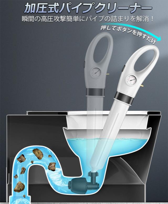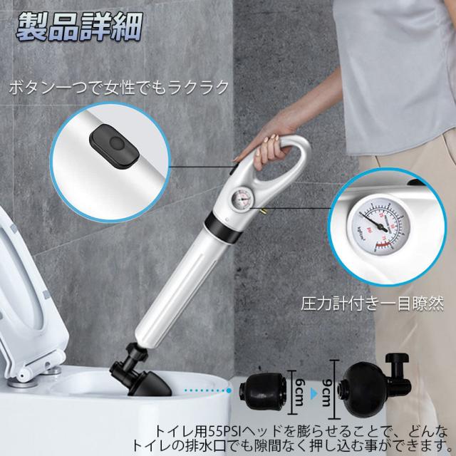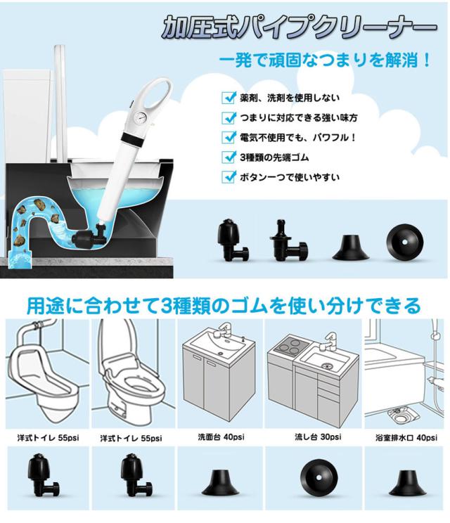 【ワンタッチでつまりを解消】本体と空気入れを接続し、次は対応な先端ゴムを選び、それから空気入れで適当な圧力を加圧し、ワンタッチつまりを解消します!トイレ、浴室、洗面台の詰まりの除去に、強力な気圧ですばやく詰まりを解消します。詰まり水に触れずクリーンな作業が可能。【丈夫で安全】パイプクリーナーは頑丈なABSプラスチック素材を使用され、耐久性に高いです。薬品や電気を使わず、安全かつ簡単に使えます。詰まった汚れを一気に解消られるのは便利です。
