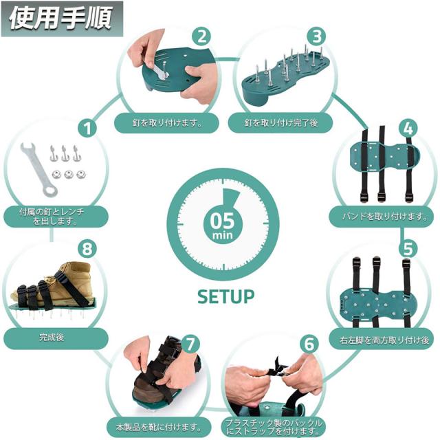 【 ガーデンスパイク】履いて歩くだけ芝生の穴あけ作業が簡単に芝生のお手入れに重要な穴あけ作業。複雑な機器や多額の費用に投資する必要はありません。ガーデンスパイク履い芝生の上を体重をかけながらゆっくり歩くだけ。足の裏のスパイクで穴あけが簡単にできます。歩くだけで穴あけ作業ができるので、とっても簡単。面倒な芝生のメンテナンスラクラクになります。