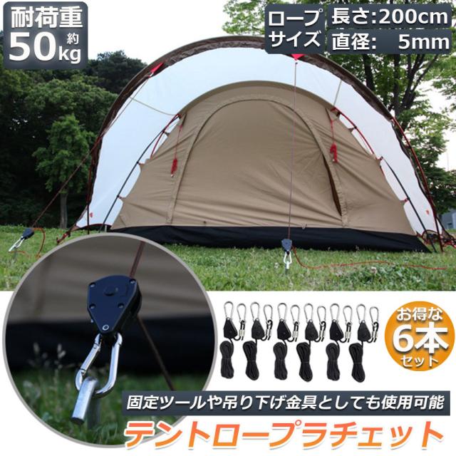テント ロープ 6本セットキャンプ バックル ロープラチェット 荷造りベルト 荷締機 調整ロープ 2m ハンガー 滑車 便利 タープテント BBQ アウトドア シェード 引越し 運搬