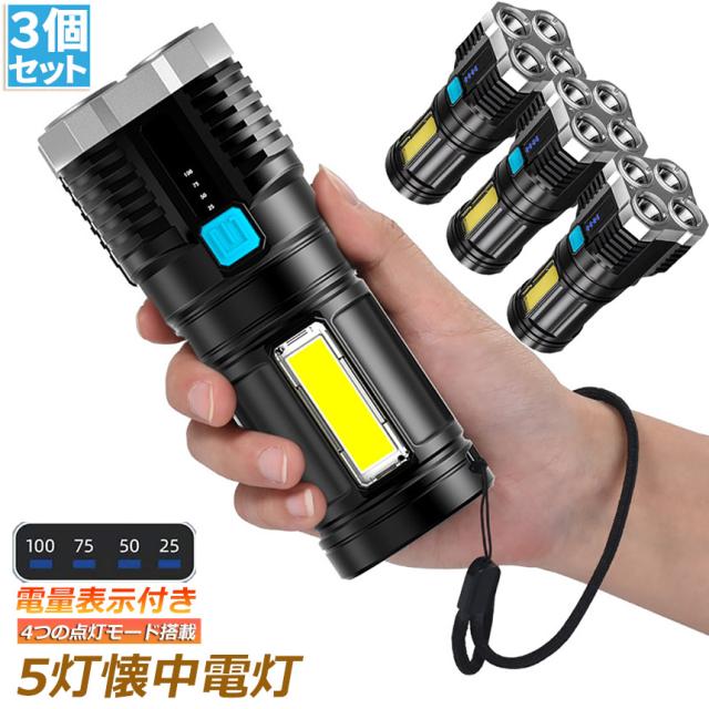 懐中電灯 3個セット 作業灯 LED 充電式 強力 高輝度 防災 地震 高輝度 ハンディライト COBライト 電力表示 大容量電池 IPX6防水 4モード 停電対策 登山 夜釣り 夜間訓練 作業灯