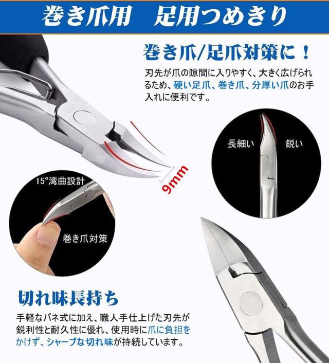 【プロな爪切り】革新的なデザインしたネイルニッパーは先端15°の角度・曲線刃仕様で刃先を長細く、巻き爪の構造を考えた設計で、切りにくい爪の細部までしっかりとカット可能。簡単に溝に爪に切断でき、よりきれい、安全です。【硬い爪・巻き爪用ニッパーつめきり】サビにくいステンレス製爪切りニッパーは非常に鋭い、握りやすいソフトグリップとバネの反発力の補助で、巻きつめ、陥入爪、分厚い爪、硬い爪などでお悩みの方は簡単にカット可能です、女性及び年上には軽い力でも一気に切れます。
