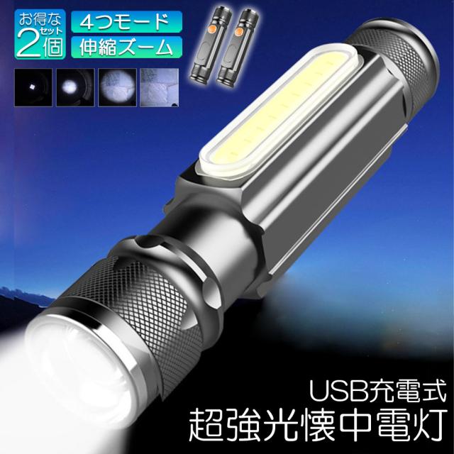 懐中電灯 LEDライト 充電式 ズーム付き 2個セット 充電式 COBライト ハンドライト USB充電 ズーム 超強光 作業灯 ワークライト クリップ マグネット アルミ合金素材 小型 軽量 防災 防水