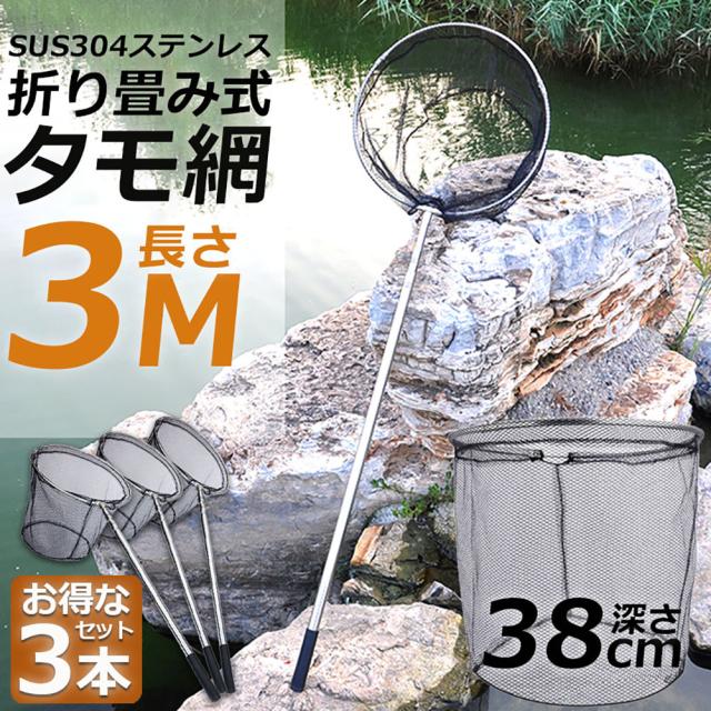 タモ網 3本セット 玉網 タモ網 ランディングネット伸縮式 すくい網 丸形網 折りたたみ式 調節可能 軽量 滑り止めハンドル ロック機能 釣り用品 漁具 淡水 海水適用 全魚種対応 シルバー 長さ3M