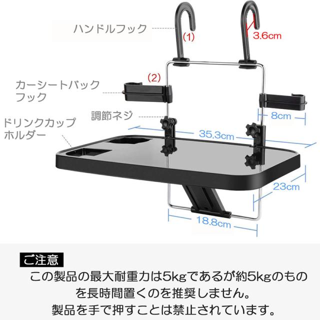 【製品仕様】車用折り畳みテーブル、長さ35.3×奥行23cm、ABS、金属、ブラック。一部の車種に適合しない場合もございますのでドアストッパーの形状をご確認下さい。※モニターの環境により、色の見え方に若干差が生じる場合がございます。