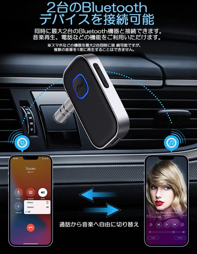 【デュアル接続】この 車 bluetooth 受信機は、同時に二つのデバイスをペアリングできます。音楽を楽しむながら着信をミスする心配がありません。このBluetooth 送信機のワイヤレス範囲に入ったら、自動的に前回ペアリングしたデバイスとペアリングします