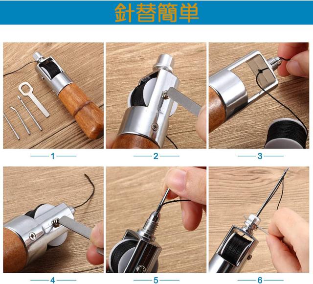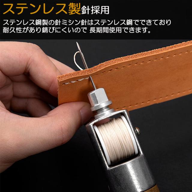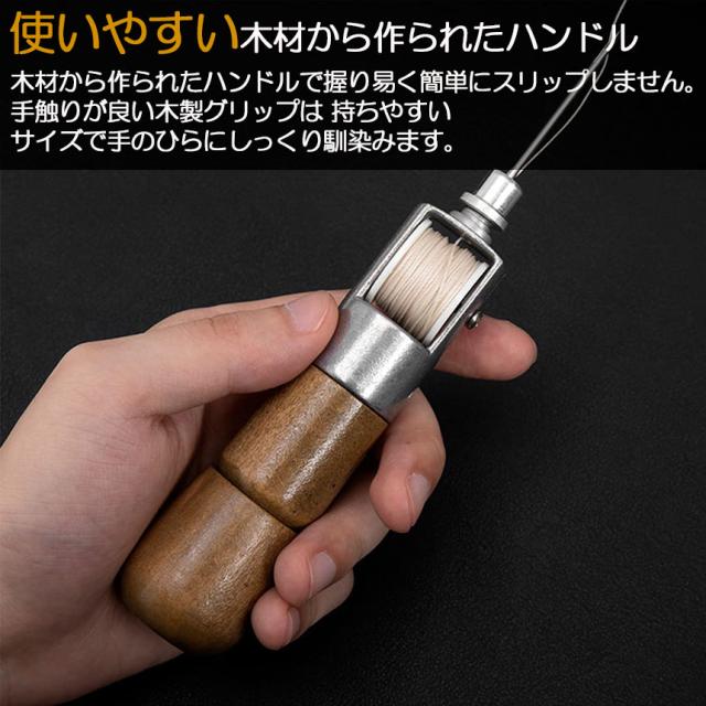 【手動ミシン・皮革用ぬい針】革製品や厚手の生地でも楽々ほつれ修理や手直しなど、初心者でも簡単にしっかりと縫うことができます。2サイズの針と1ロールのミシン糸を備えた木製ハンドル付きのユニークなミシン千枚通し。【用途に応じて針を交換できる】軽くて丈夫なアルミ柄・貫通柄、錆びにくいステンレス針です。握りやすく使いやすい、ちょっとした縫い物やほつれなどを素早く簡単に、サッと出してサッと使えます。一般に販売されているミシン針も使うこともできますので、用途に応じて針を交換でき、薄めの布を縫うのにとても便利です。穴あけ・線引き・革小物や革バッグの製作や補修には最適です。