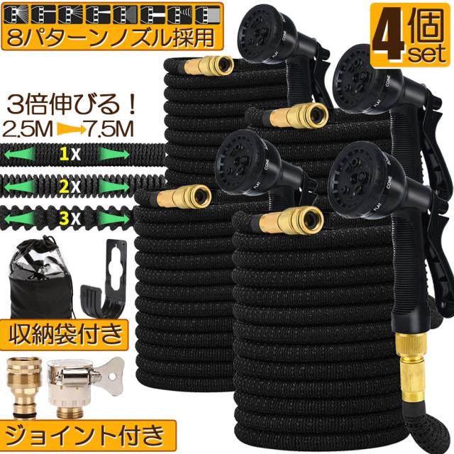 ホース 散水ホース 4個セット ホースリール 伸縮ホース 伸びるホース 洗車ホース 3倍に伸びる 超軽量 伸びるホースノズル 散水ノズル コンパクト収納 洗車 ガーデニング 庭 ベランダ 玄関 散水 大掃除 収納袋 付き