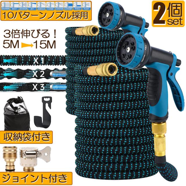 ホース 散水ホース 2個セット ホースリール 伸縮ホース 伸びるホース 洗車ホース 15M 3倍に伸びる 10パターンノズル 超軽量 伸びるホースノズル 散水ノズル コンパクト収納 洗車 ガーデニング 庭 ベランダ 玄関 散水 大掃除 収納袋 付き